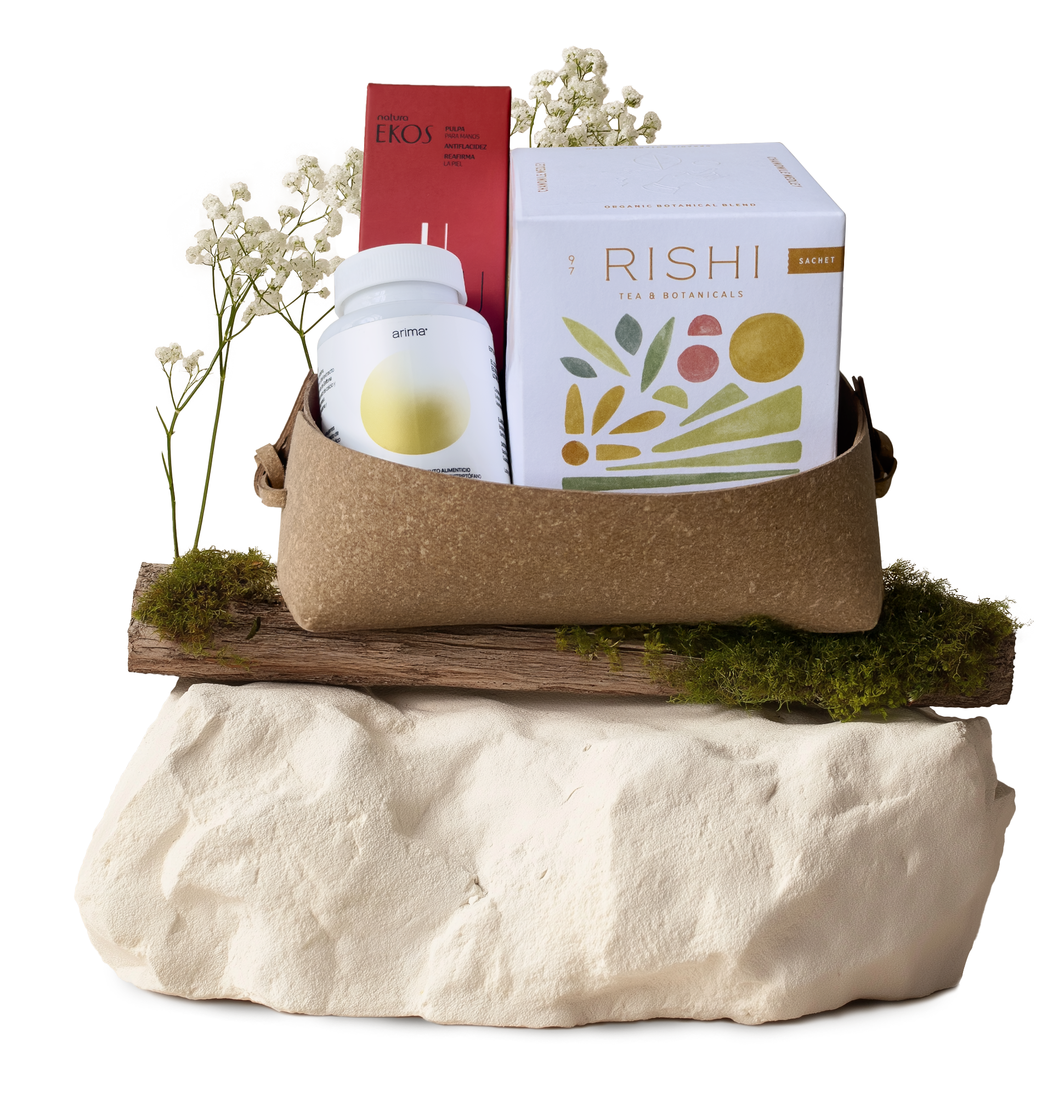 Cuidado del cuerpo y alma con complementos funcionales (elige entre Calm, 5-HTP o PS), té de manzanilla y pulpa hidratante vegana.